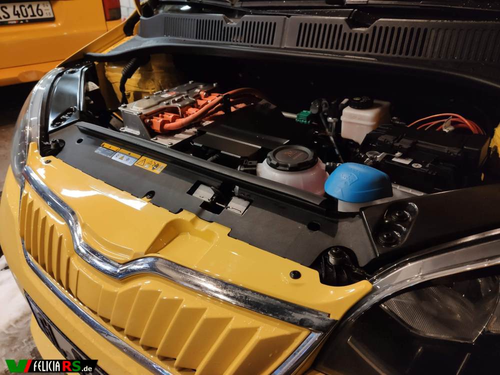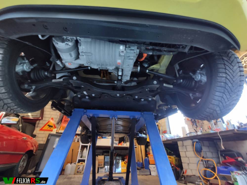 Auch hab ich den eigentlich für ein Elektroauto trockenen und sauberen Motorraum von unten mit einer Motorabdeckung versehen. Keine Ahnung ob dies positive Effekte auf den Verbrauch hat, aber zumindest bleit es dort sauberer und da hatte der Salzreiche Winter schon Spuren hinterlassen.