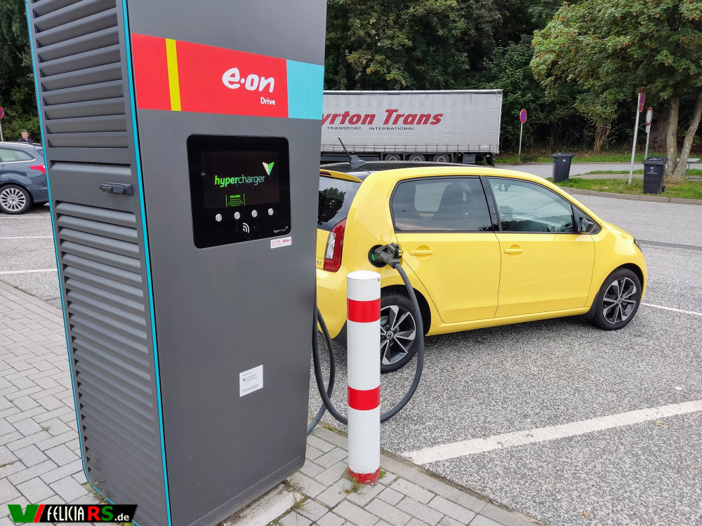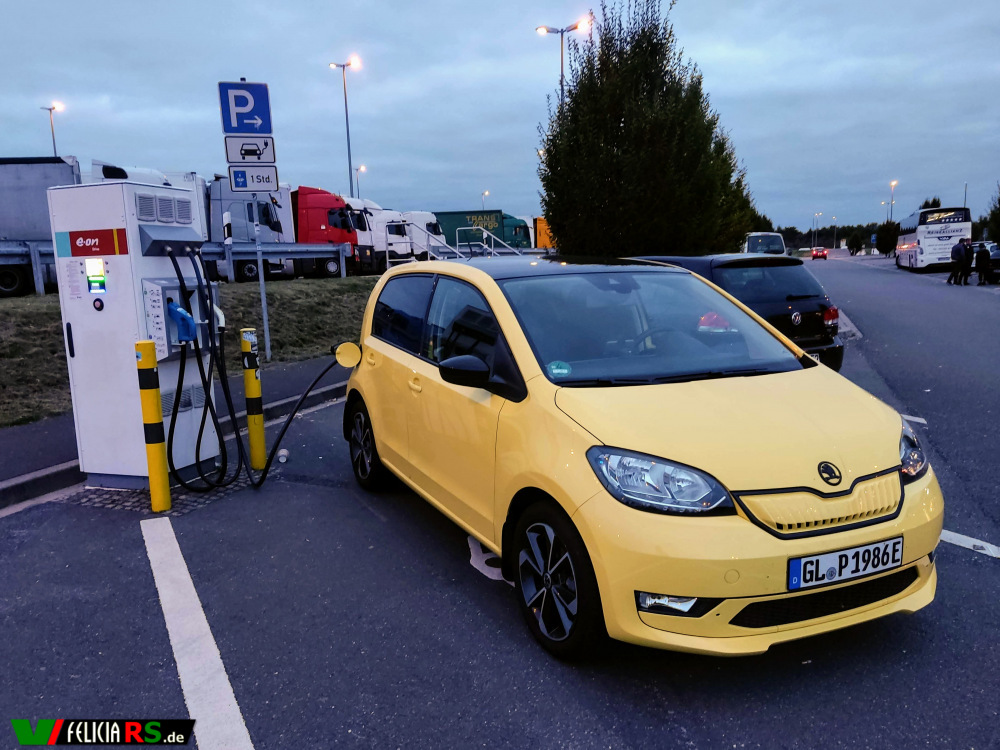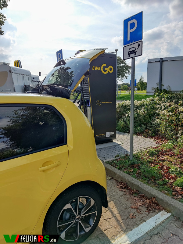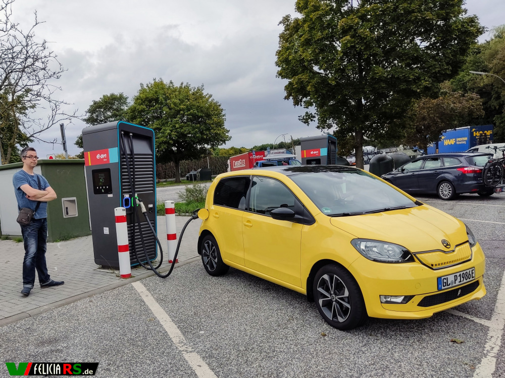 Nach den Erfahrungen vom Montag haben wir uns entschlossen die 527km nach Eckernförde gemütlich zu fahren. Das Navi hat uns hierfür auch über Hannover geschickt weil auf dem Abschnitt nach Bremen irgendwie immer Stau war. Auf dem Hinweg haben wir 2 Stopps an Schnellladesäulen gemacht und dabei einmal bei EWE und einmal bei Eon angehalten. Die Pause betrug dabei immer um die 55 Minuten. Der Citigo ist ja nicht der Schnellste mit seinen „offizellen“ 50kW Ladeleistung. In der Praxis waren es im Schnitt eher 31 – 21kW an der Schnellladesäule. Die Längste Strecke am Stück waren dann übrigens auch 227km am Stück gestartet bei 100% Batterielevel.