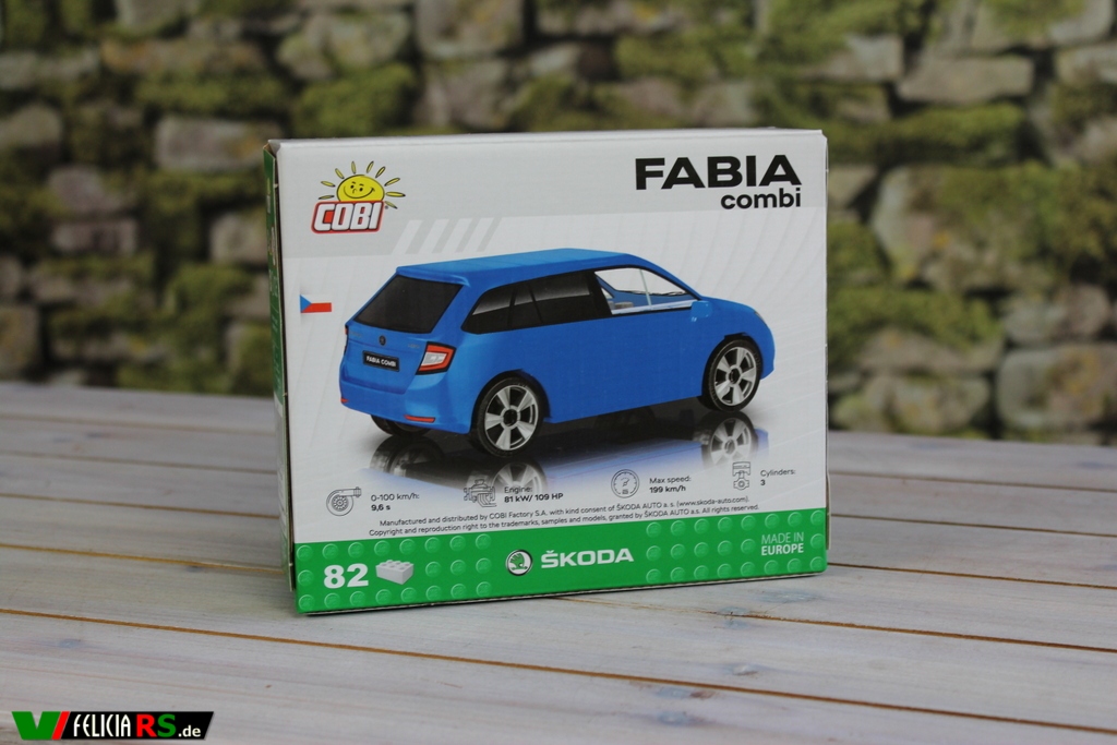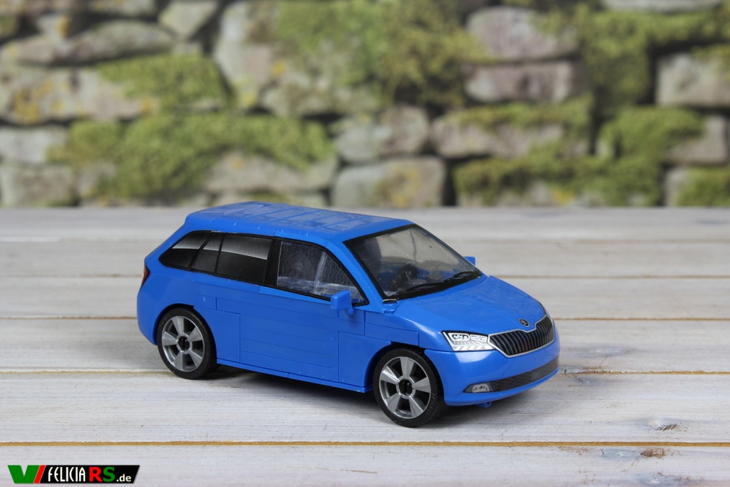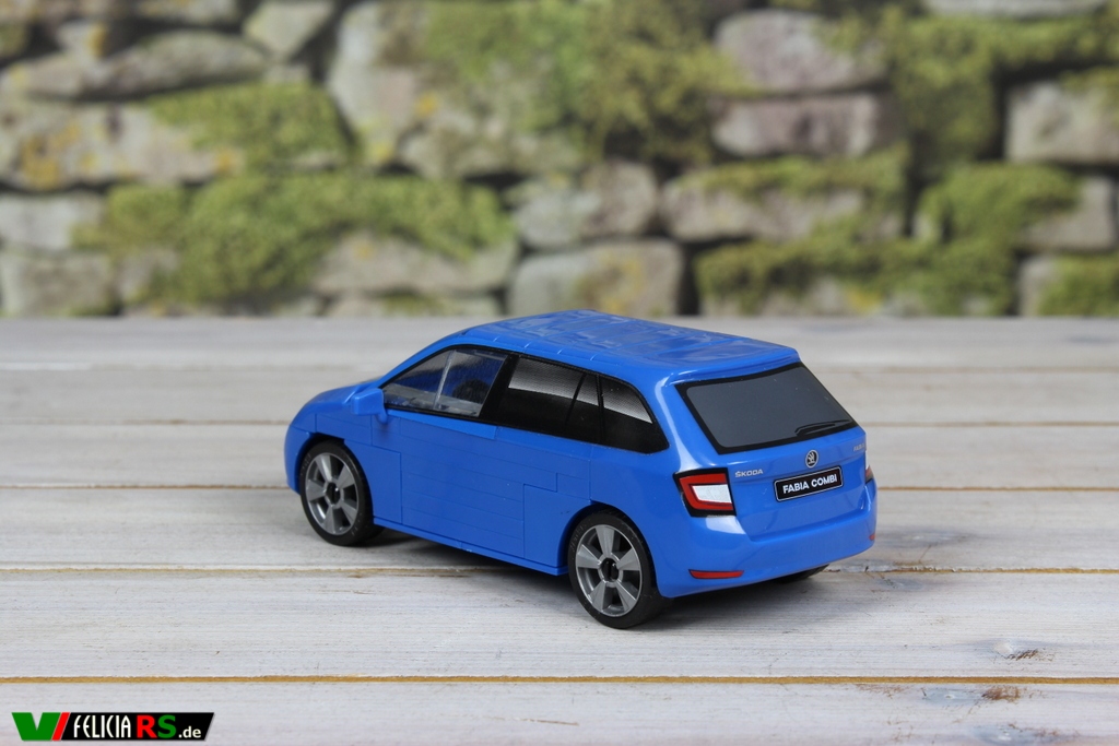 Der Fabia Combi besteht aus 82 Teilen und unterscheidet sich im wesentlichen vom roten Hatchback durch den größeren Rucksack den er angesteckt bekommt und eben durch die Aufkleber welche ihm die Seitenlinie des Combis verpassen. Die Farbabweichungen des Aufklebers zum Blau des Fabias fallen bei wirklicher Betrachtung weitaus geringer aus als es auf den Fotos aussieht. Zweifelsohne wäre der Unterschied bei guten Drucken die COBI durchaus beherrscht noch geringer ausgefallen wie man schon am Frontscheibenrahmen erkennen kann.